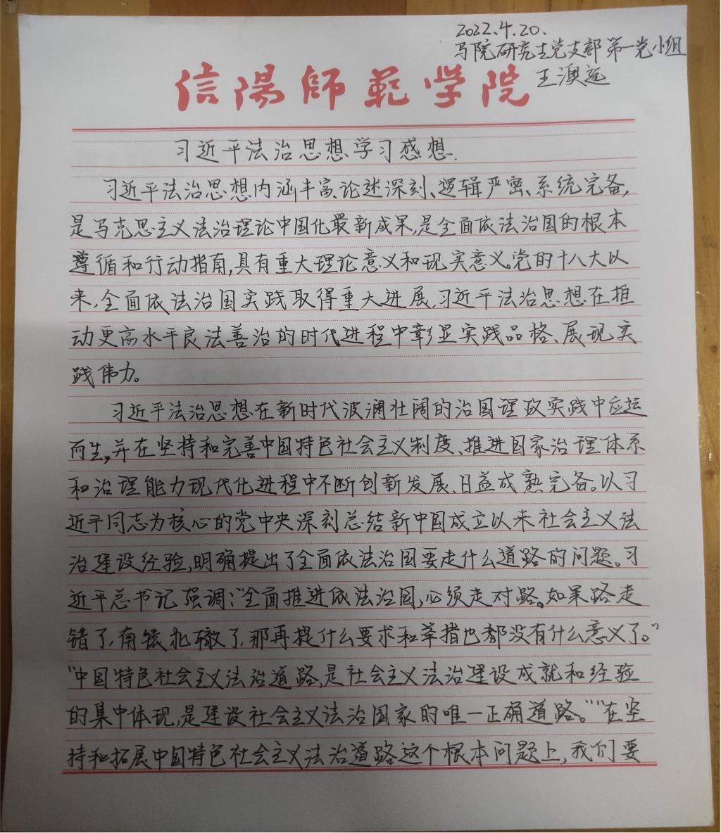 为深入学习贯彻习近平法治思想,增强新葡萄官网研究生党员的政治素养和法治意识,新葡萄官网研究生党支部开展了习近平法治思想学习交流主题党日活动。新葡萄官网研究生党员、预备党员及发展对象积极参与,充分运用互联网等多渠道展开学习,通过观看相关法治宣传片、系统学习习近平法治思想,进一步增强法治意识和思想觉悟。大家根据学习情况,结合自身实际,认真撰写学习习近平法治思想的心得感悟,以下为部分同志撰写的心得感悟图片。