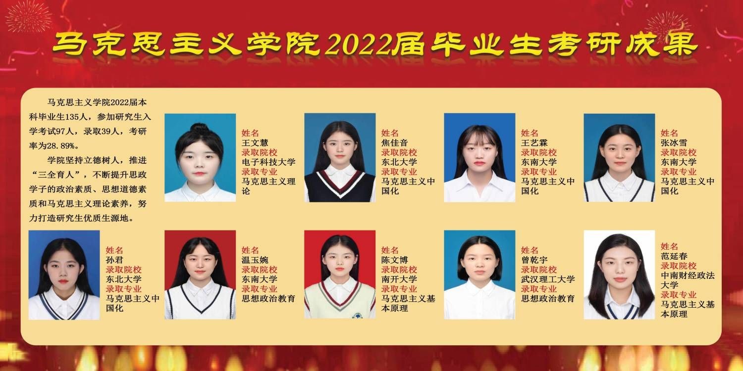 本科毕业生考研录取率是衡量人才培养质量的重要体现。2022年,随着全国硕士研究生招生录取工作相继结束,新葡萄8883官网AMG考研学子捷报频传,再创佳绩。据悉,新葡萄8883官网AMG2022届本科毕业生135人,参加研究生入学考试97人,录取39人,考研率为28.89%。