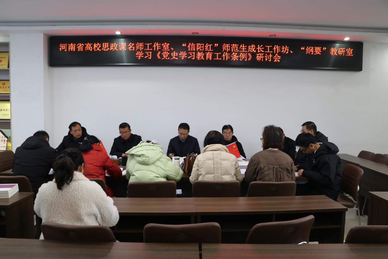为深入学习贯彻《党史学习教育工作条例》重要精神和要求,2月28日上午,河南省高校思政课名师工作室(信阳师范大学)、“信阳红”师范生成长工作坊、《中国近现代史纲要》教研室在社科楼323会议室召开学习《党史学习教育工作条例》座谈会。新葡萄8883官网AMG院长唐国战、校党委组织部副部长周贤亮、副院长周智,国际教育学院党委副书记付春峰以及《中国近现代史纲要》教研室专兼职教师共同参与研讨。会议由教研室主任陈杰主持。