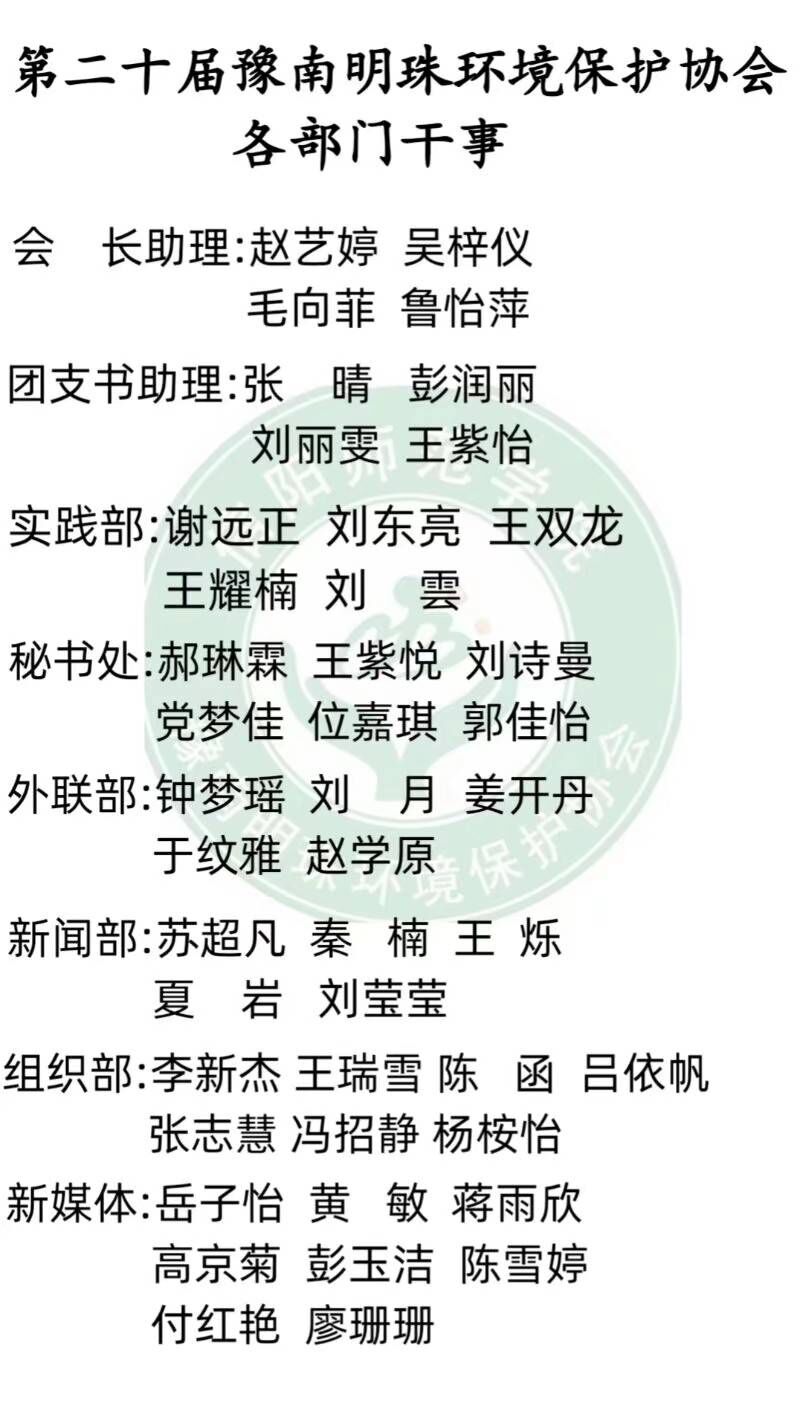 为加强社员间的交流,增进社员间的关系,营造和谐的社团氛围,10月22日晚,豫南明珠环境保护协会2020-2021学年第一次全会暨部门招新在社科楼516教室顺利举行。学生会分管主席、前会长、前团支书、现任会长、现任团支书及各部部长共同出席了本次会议。全体社员共同参加了本次会议。会议由会长劳文萍主持。