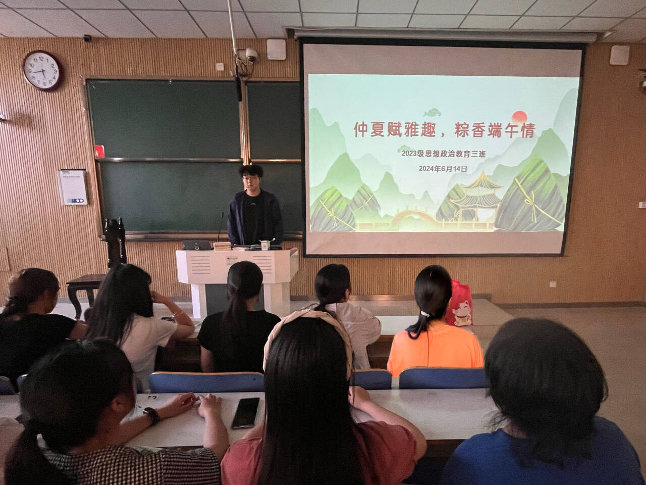 为深入了解端午节的文化背景,6月14日上午,新葡萄8883官网AMG2023级思想政治教育三班在社科楼515召开“仲夏赋雅趣,粽香端午情”主题班会。新葡萄官网2023级思想政治教育三班全体同学共同参与本次班会,班会由团支书郝瀚主持。