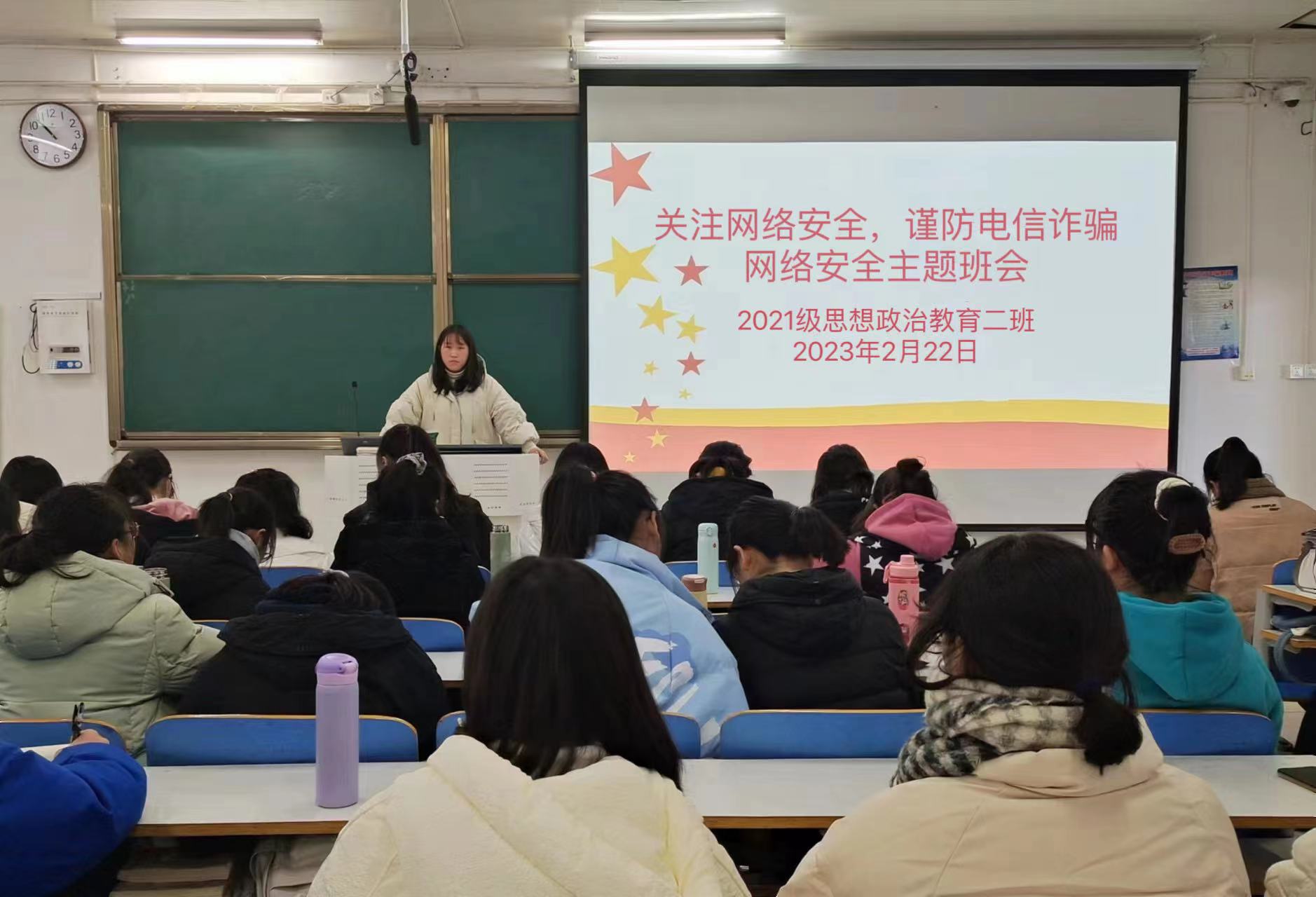 2月22日下午,新葡萄8883官网AMG2021级思想政治教育二班在社科楼514教室召开“关注网络安全,谨防电信诈骗”主题班会。2021级思想政治教育二班全体同学参加此次班会。班会由团支书王婧欣主持。