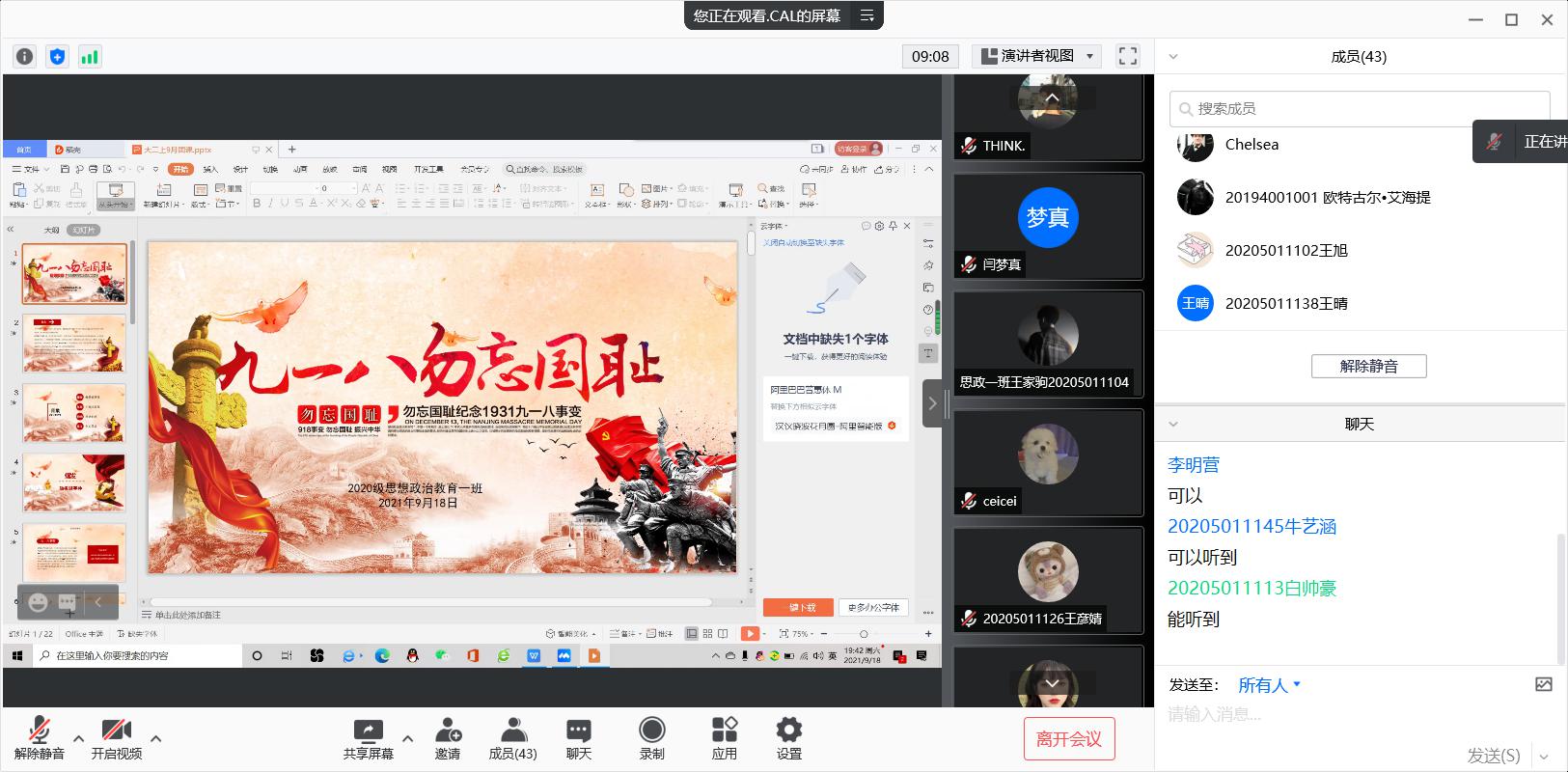 9月18日,新葡萄8883官网AMG2020级思想政治教育一班在腾讯会议上召开“九一八勿忘国耻”团课。2020级思想政治教育一班全体同学参加此次团课,团课由团支书卢茜雨主持。