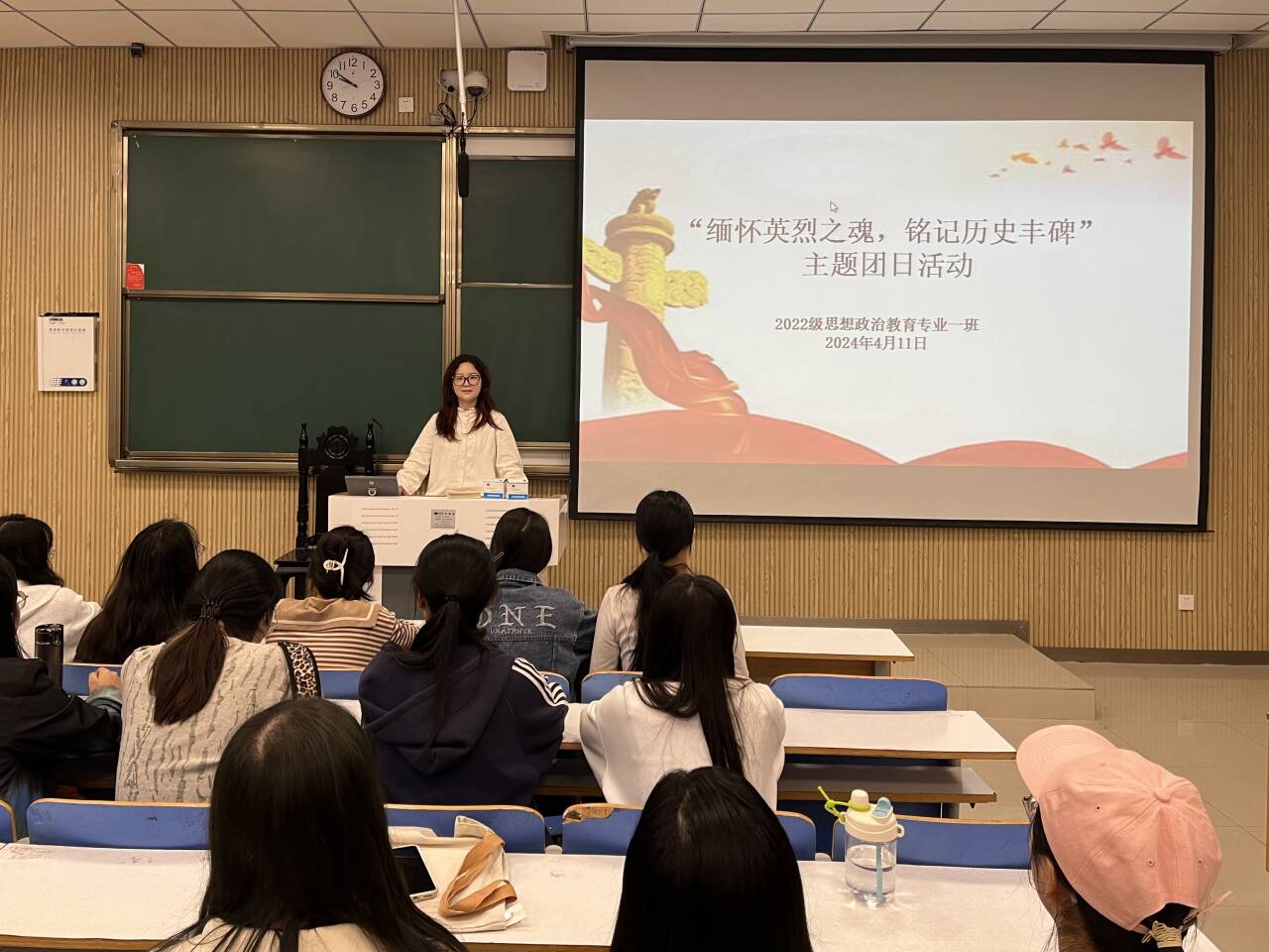 首先,李佳茹向同学们介绍清明节的由来与习俗,她指出,祭扫是清明节的重要仪式,更是缅怀先人的传统方式,缅怀革命英烈不仅是为了回顾历史,更是为了在缅怀中凝聚前行力量。接着,李佳茹向同学们讲述了革命先烈的英雄故事,通过详细讲述董存瑞、邱少云和狼牙山五壮士的事迹,并通过放映视频的形式带领同学们进一步了解先辈们的革命生涯,感受炮火中热血与信仰并存的红色印记,引导同学们共同缅怀那些果敢无畏、为民族独立和人民幸福而英勇牺牲的先烈。最后,李佳茹针对本次团课内容向同学们提出三点建议:一是要聆听英雄故事,感悟英烈精神,汲取精神养分;二是要学习共产党人艰苦奋斗、开拓进取的伟大品格,保持积极的学习态度;三是要勇于探索、敢于实践,为中华民族伟大复兴贡献力量。