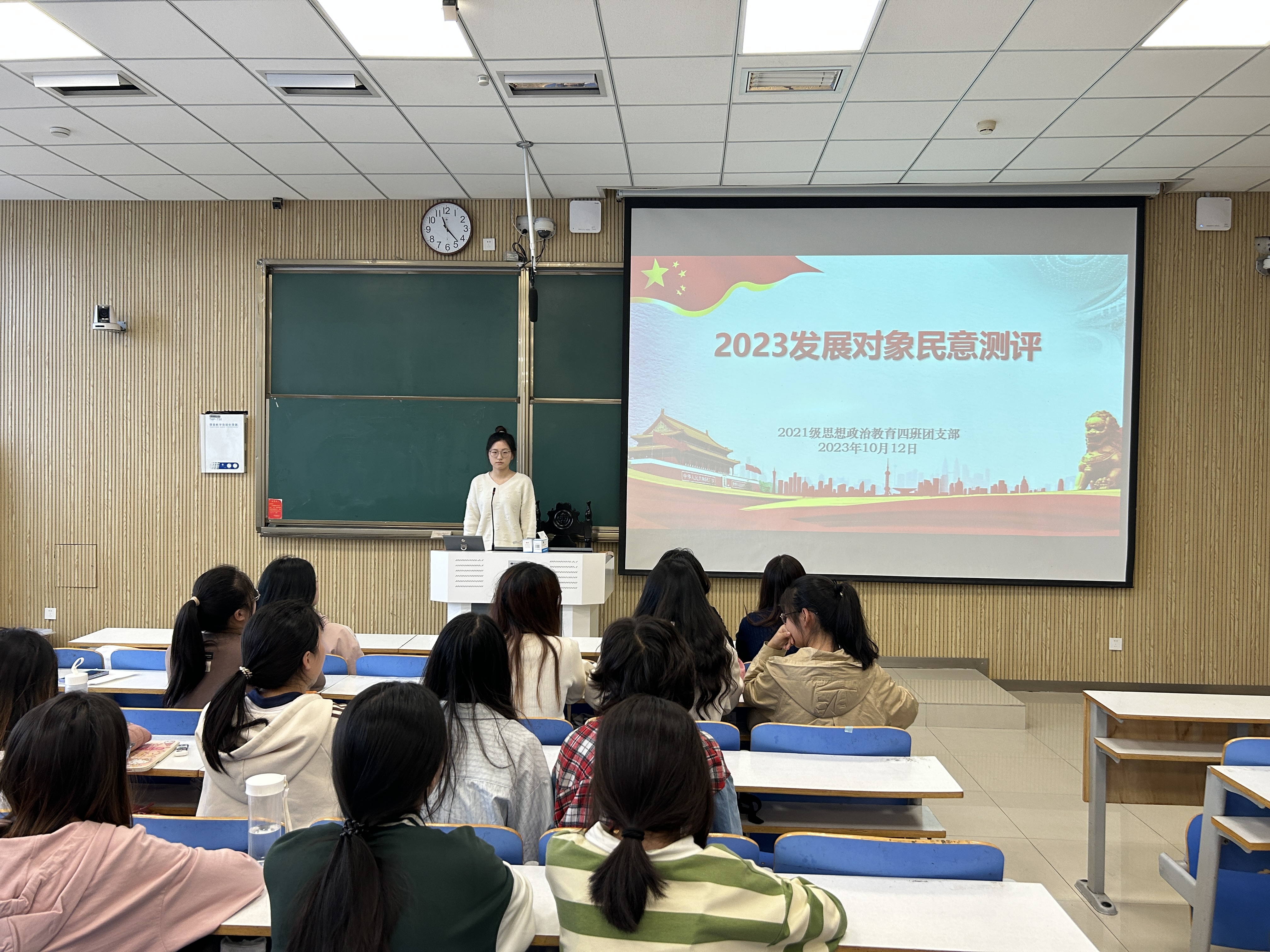 10月12日下午,新葡萄8883官网AMG2021级思想政治教育四班在社科楼514教室召开2023年发展对象民意测评会。2021级思想政治教育四班全体团员共同参会。会议由团支书刘珂含主持。