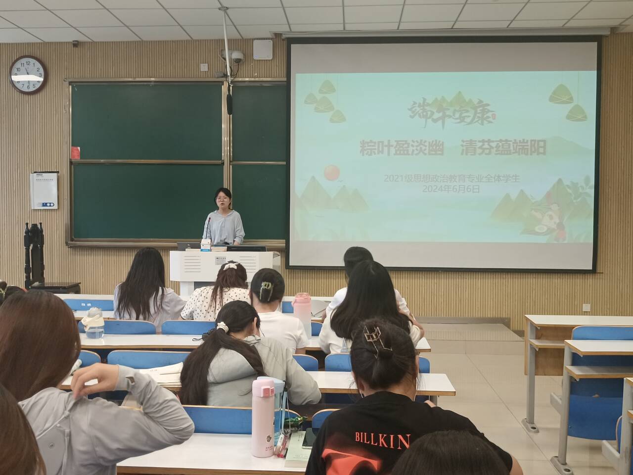 6月6日上午,新葡萄8883官网AMG2021级思想政治教育全体学生在社科楼515教室召开“粽叶盈淡幽,清芬蕴端阳”主题班会。2021级思想政治教育三班、四班学生参加此次主题班会。班会由辅导员高小佳主持。